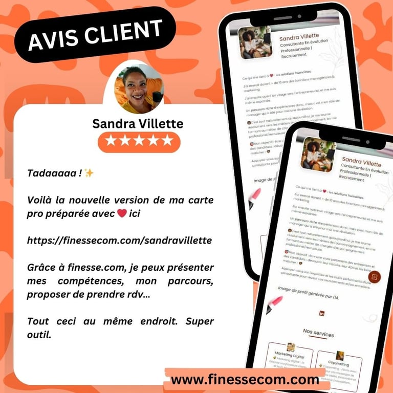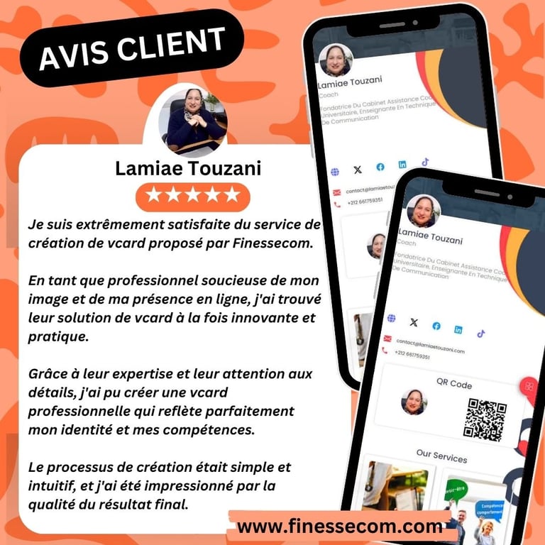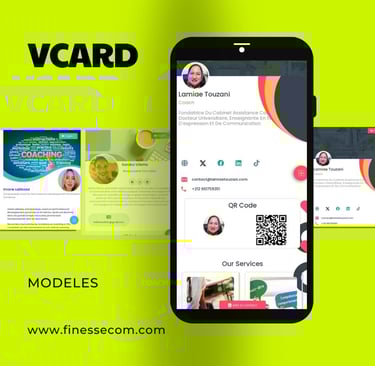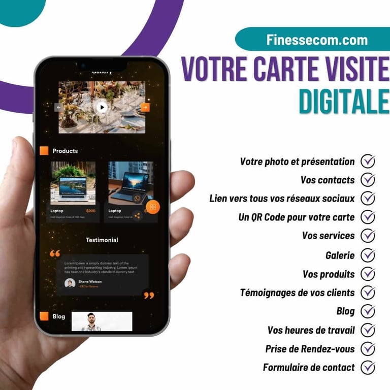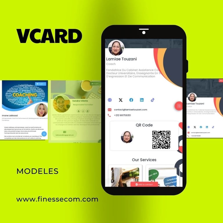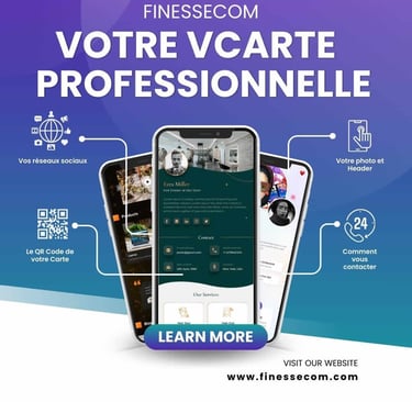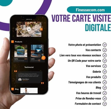 Finessecom.com vous permet de de créer des cartes de visite Digitales contenant de nombreuses informations et de la partager avec vos clients afin qu'il soit facile pour tout le monde de vous trouver.